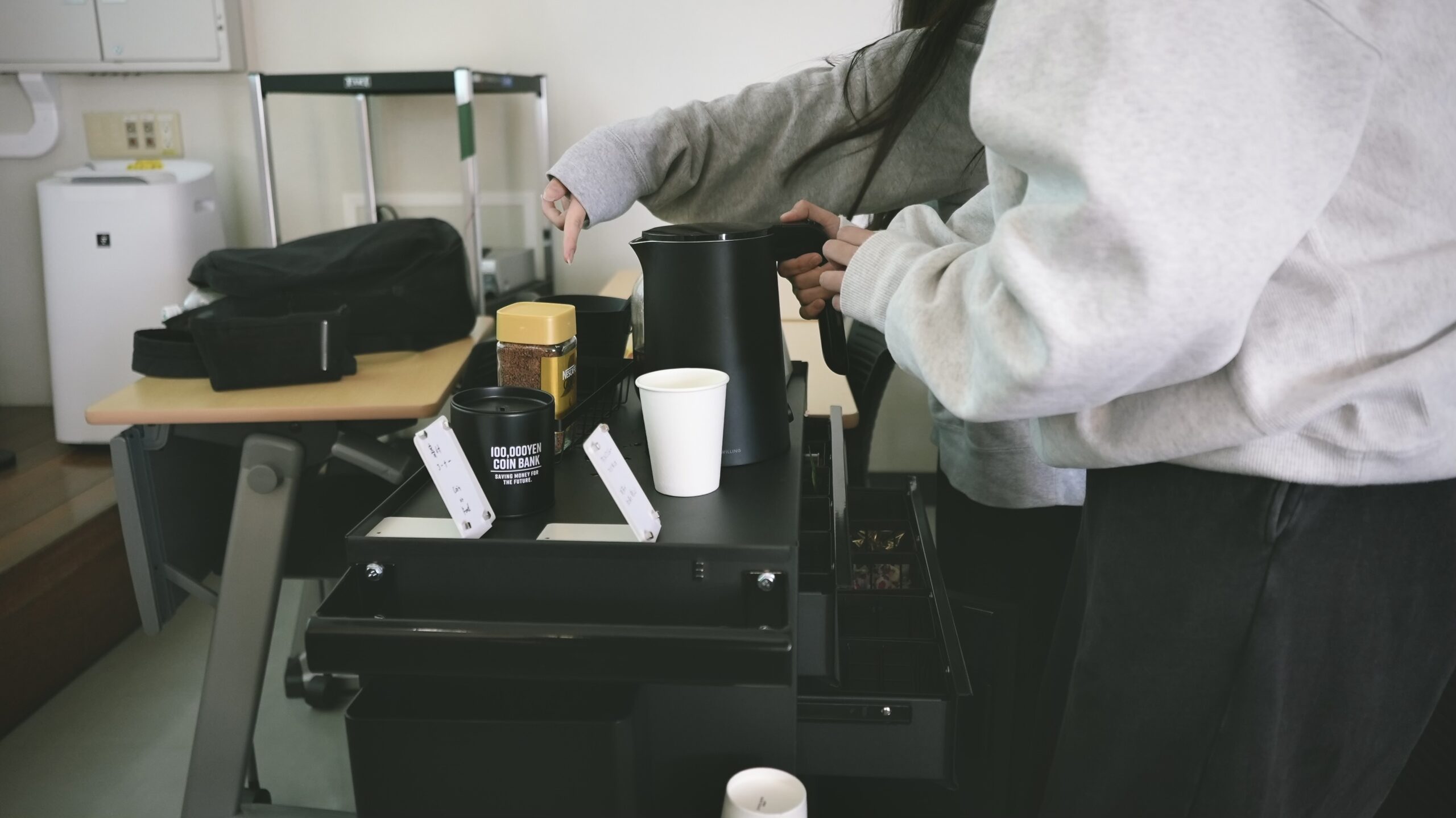 カフェコンテナをアップデートさせた。引き出しの中には紅茶やコーヒー、お茶菓子が入っている。横には紙コップやゴミ箱がマグネットで収納されている。