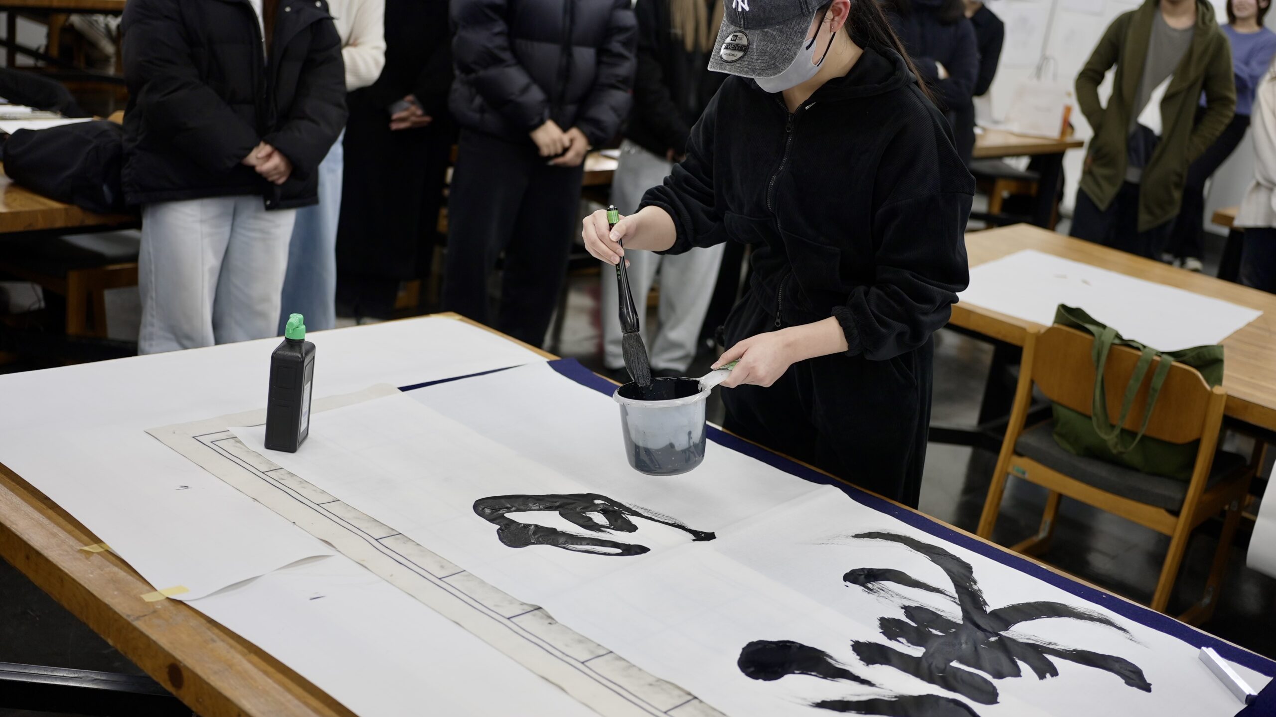 書道をやっている学生に教えてもらって、周りの学生が試してみている瞬間