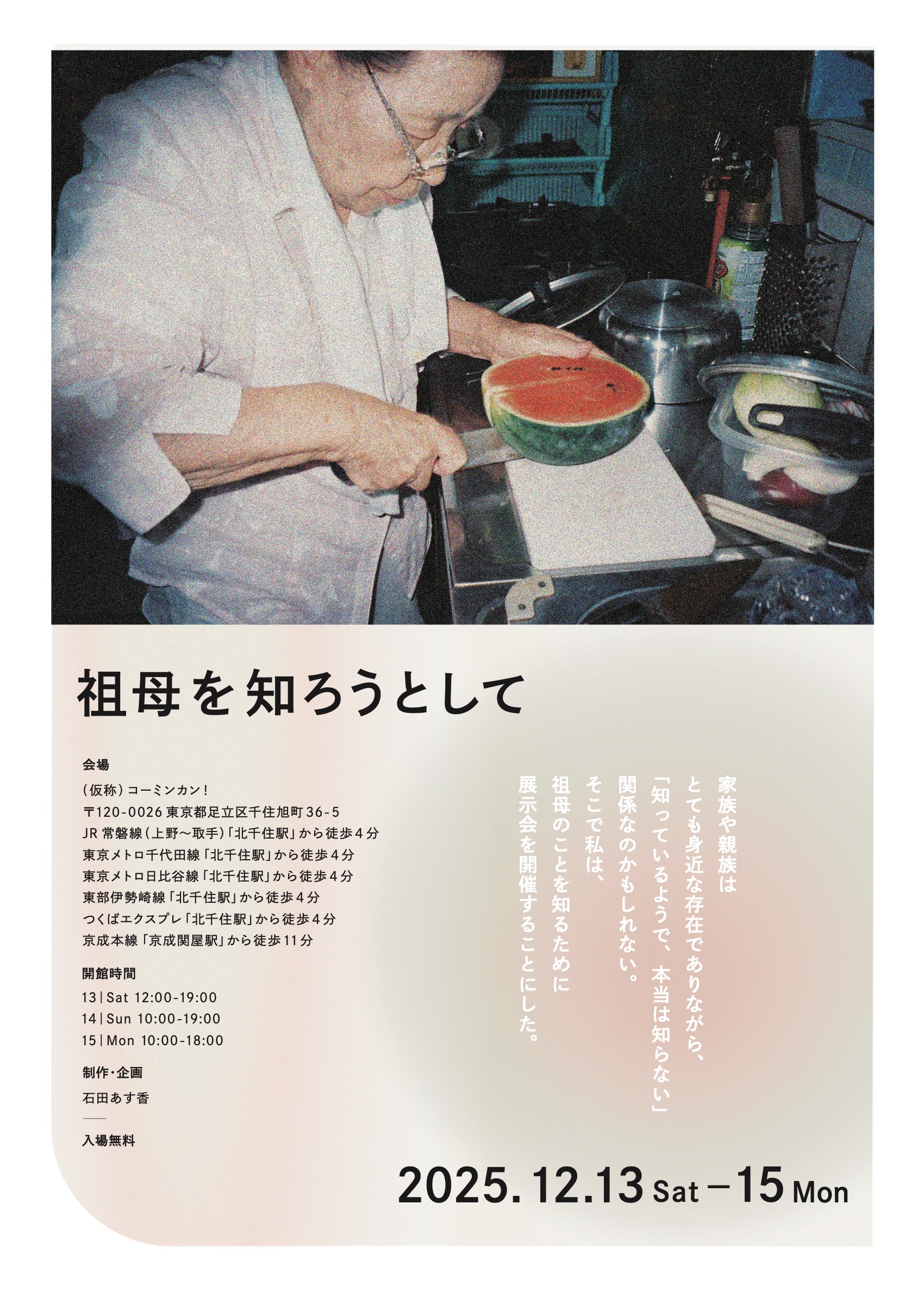 北千住のコーミンカンという展示スペースにで 12月13日から15日まで、ラボ学生が卒業研究で「祖母を知ろうとして」という展示会を開きます。ちなみに、この卒業研究は、展示会をひらくことで、祖母をいかに知るのかという研究です。14日のお昼頃、私も伺おうと思います。