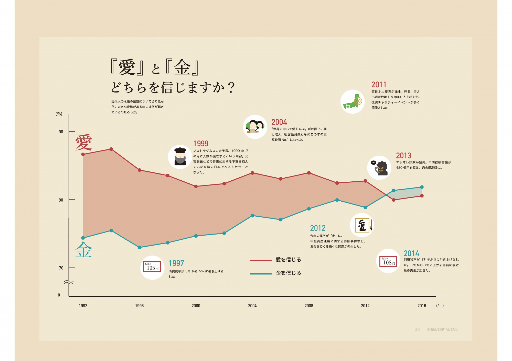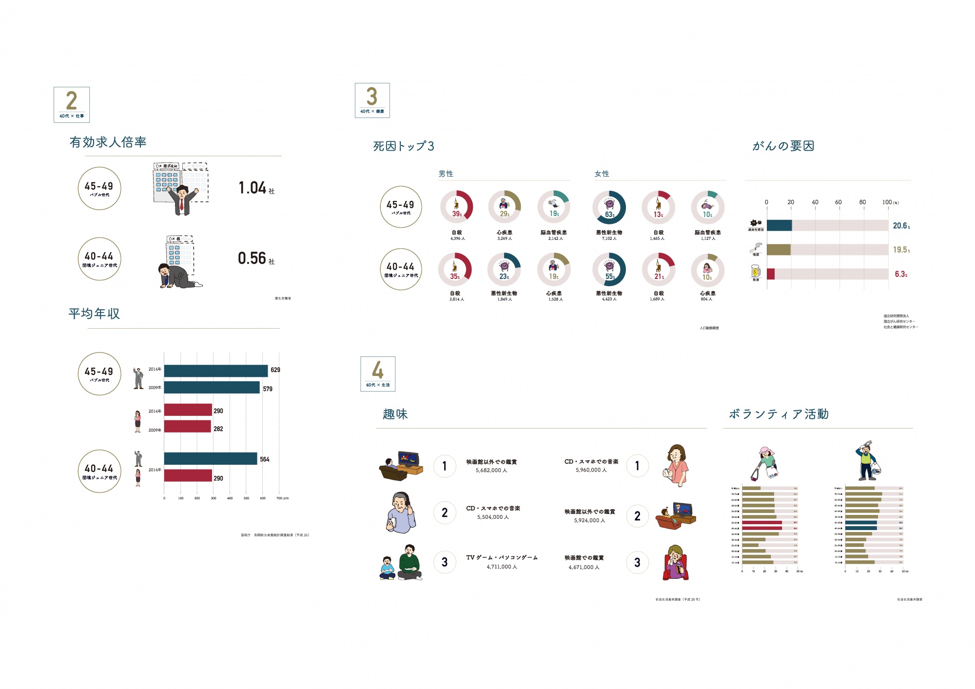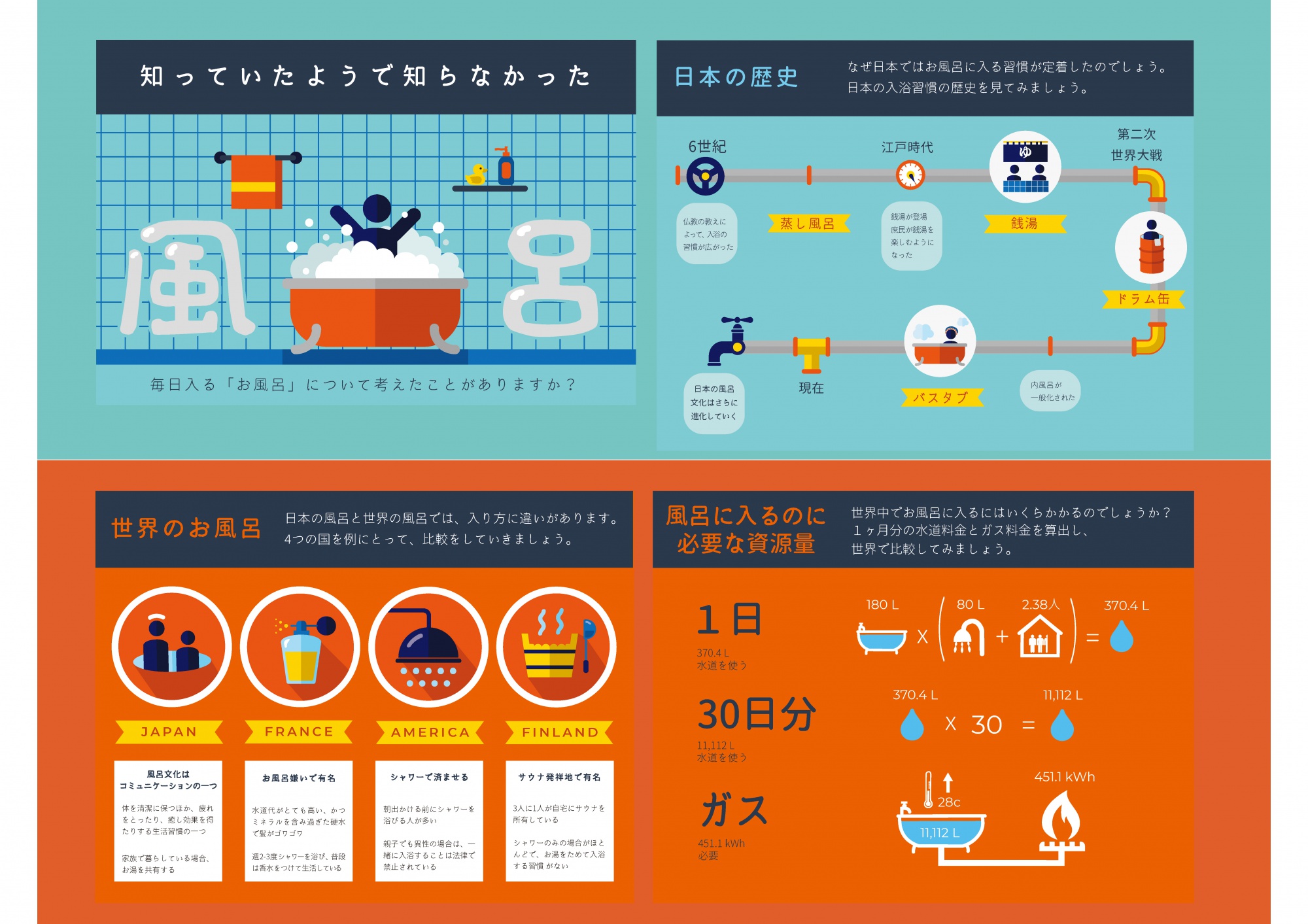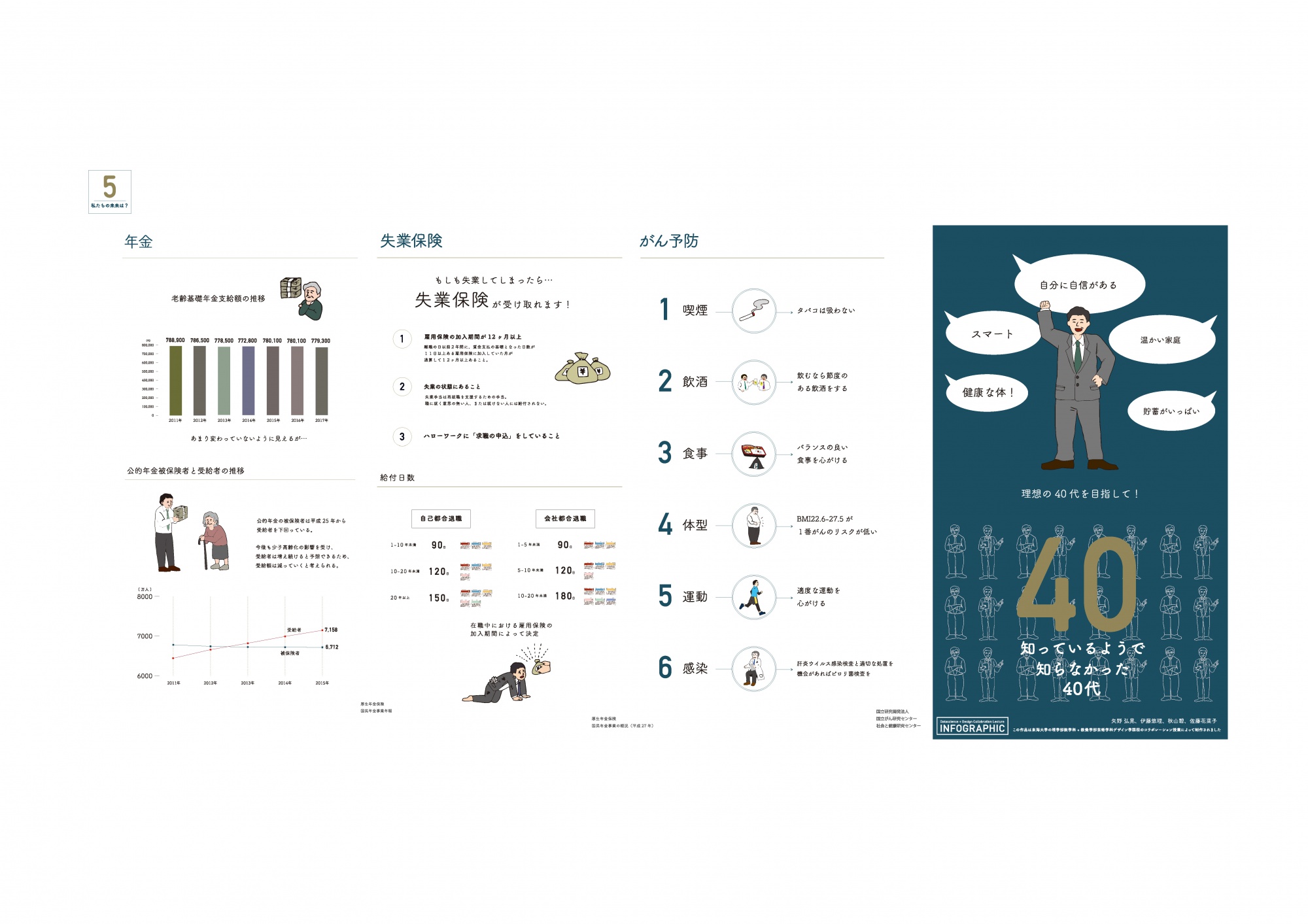 理学部数学科の学生と教養学部芸術学科の学生が協働してインフォグラフィックを作る授業の発表会を開催しました。この授業は、数学科と芸術学科で構成された4〜5名程度の5つのチームが、自分たちで決めたテーマについて調べてインフォグラフィックを制作する半期の授業です。今年は「知っていたようで知らなかった〇〇」という課題設定となっており、結婚、40代、お金、風呂、宗教の五つのテーマで作品が作られました。